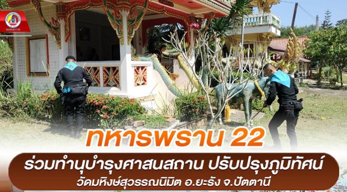 ทหารพราน 22 ร่วมทำนุบำรุงศาสนสถาน ปรับปรุงภูมิทัศน์วัดมหิงษ์สุวรรณนิมิต อ.ยะรัง จ.ปัตตานี