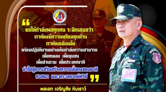 “…ขอให้กำลังพลทุกคนระลึกเสมอว่า… เราต้องมีความพร้อมทุกด้าน เราต้องเข้มแข็ง พร้อมปฏิบัติงานอย่างเต็มกำลังความสามารถ เพื่อตนเอง เพื่อชุมชน เพื่อส่วนรวม เพื่อประเทศชาติ นำไปสู่การเสริมสร้างความมั่นคงของชาติ ศาสนา และพระมหากษัตริย์…“