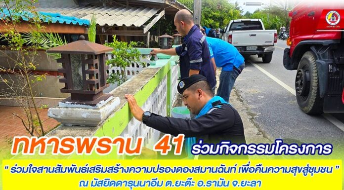 ทหารพราน 41 ร่วมโครงการ “ร่วมใจสานสัมพันธ์ เสริมสร้างความปรองดองสมานฉันท์ เพื่อคืนความสุขสู่ชุมชน” ณ มัสยิดดารุนนาอีม ต.ยะต๊ะ อ.รามัน จ.ยะลา
