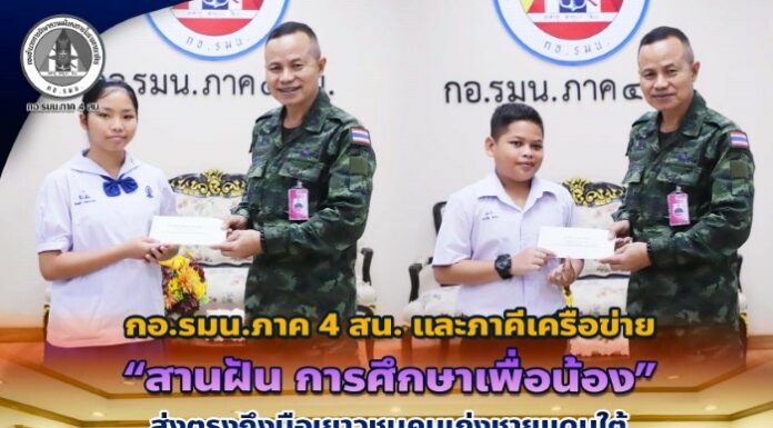 กอ.รมน.ภาค 4 สน. และภาคีเครือข่าย “สานฝัน การศึกษาเพื่อน้อง” มอบทุนการศึกษากว่า 1 แสน 9 หมื่นบาท ส่งตรงถึงมือเยาวชนคนเก่งชายแดนใต้ เพราะ “การศึกษา” นำมาซึ่งความสำเร็จ เปรียบเสมือนต้นไม้ที่งอกงามมั่นคง