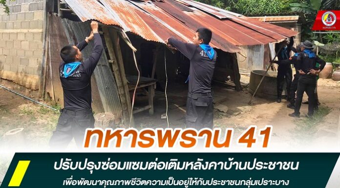 ทหารพราน 41 ช่วยเหลือ ปรับปรุงซ่อมแซมต่อเติมหลังคาบ้าน เพื่อพัฒนาคุณภาพชีวิตความเป็นอยู่ให้ประชาชนกลุ่มเปราะบาง