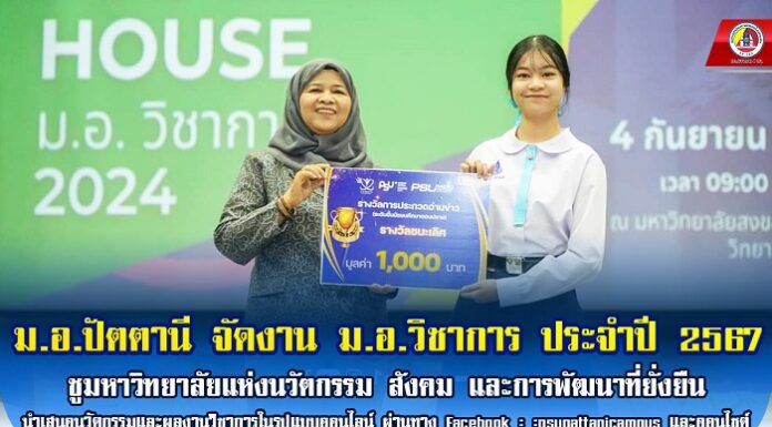 วันที่ 4 กันยายน 2567 ที่มหาวิทยาสงขลานครินทร์ วิทยาเขตปัตตานี ตำบลรูสะมิแล อำเภอเมือง จังหวัดปัตตานี นางพาตีเมาะ สะดียามู ผู้ว่าราชการจังหวัดปัตตานี เป็นประธานในพิธีเปิดงาน ม.อ.ปัตตานี จัดงาน ม.อ.วิชาการ ประจำปี 2567 โดยมี ผศ.ดร.อรุณีวรรณ บัวเนี่ยว รองอธิการบดีฝ่ายวิจัยและพันธกิจสังคม วิทยาเขตปัตตานี กล่าวรายงาน กิจกรรมประกอบด้วย การแสดงผลงานวิจัยและนวัตกรรม ,การเสวนาด้านวิชาการ ,การบรรยายแลกเปลี่ยนเรียนรู้ ,การจัดแสดงนิทรรศการ ,การแข่งขันและการประกวดทักษะด้านวิชาการ และสิ่งประดิษฐ์ ,การจัดแสดงนิทรรศการและผลิตภัณฑ์ชุมชน
