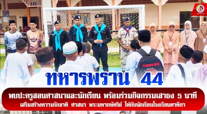 ทหารพราน 44 พบปะครูสอนศาสนาและนักเรียน พร้อมร่วมกิจกรรมเสาธง 5 นาที เสริมสร้างความรักชาติ ศาสนา พระมหากษัตริย์ ให้กับนักเรียนโรงเรียนตาดีกา