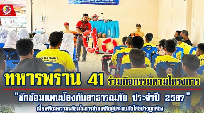 ทหารพราน 41 ร่วมกิจกรรมตามโครงการ “ซักซ้อมแผนป้องกันสาธารณภัย ประจำปี 2567” เพื่อเตรียมความพร้อมในการช่วยเหลือผู้ประสบภัยได้อย่างถูกต้อง