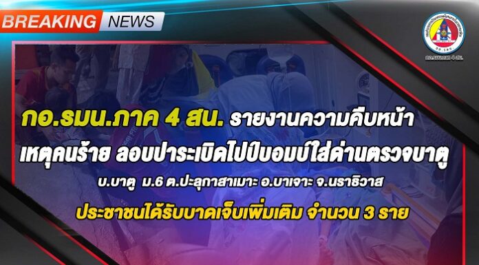 กอ.รมน.ภาค 4 สน. รายงานความคืบหน้าผู้ได้รับบาดเจ็บเพิ่มเติม เหตุคนร้ายลอบปาระเบิดไปป์บอมบ์ใส่ด่านตรวจบาตู บ.บาตู ม.6 ต.ปะลุกาสาเมาะ อ.บาเจาะ จ.นราธิวาส