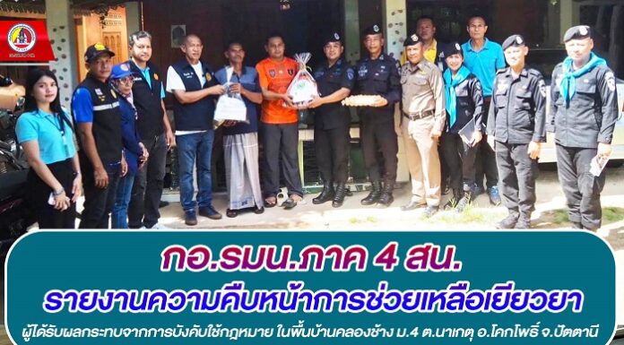 กอ.รมน.ภาค 4 สน. รายงานความคืบหน้าการช่วยเหลือเยียวยาผู้ได้รับผลกระทบจากการบังคับใช้กฎหมาย ในพื้นที่ บ้านคลองช้าง ม.4 ต.นาเกตุ อ.โคกโพธิ์ จ.ปัตตานี