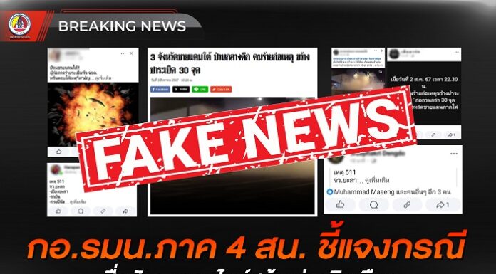 กองอำนวยการรักษาความมั่นคงภายในภาค 4 ส่วนหน้า ขอเรียนชี้แจงให้ทราบว่า จากการตรวจสอบกับหน่วยงานความมั่นคงในพื้นที่ 3 จังหวัดชายแดนภาคใต้ และ 4 อำเภอของจังหวัดสงขลา ไม่พบการรายงานว่าเกิดเหตุการณ์ดังกล่าวขึ้น ซึ่งเนื้อความที่เป็นข่าวเป็นการจงใจสร้างข่าวเท็จ บิดเบือน หวังก่อให้เกิดความแตกแยกวุ่นวายในสังคม จึงขอให้พี่น้องประชาชนโปรดใช้วิจารณญาณในการเปิดรับข้อมูลข่าวสารอย่างรอบด้าน ตรวจสอบข้อเท็จจริงก่อนที่จะเชื่อ หรือส่งต่อข้อมูลดังกล่าวออกไป เพื่อไม่ให้ตกเป็นเหยื่อของขบวนการที่มุ่งทำลายความเชื่อมั่นของเจ้าหน้าที่รัฐ ซึ่งอาจส่งผลกระทบต่อสังคมโดยรวม รวมถึงจะมีความผิดทางกฎหมาย ตามพระราชบัญญัติว่าด้วยการกระทำความผิดเกี่ยวกับคอมพิวเตอร์ อีกด้วย หากมีข้อสงสัยสามารถติดตามข้อมูลข่าวสารข้อเท็จจริงได้ทางเพจ Facebook ศูนย์ประชาสัมพันธ์ กองอำนวยการรักษาความมั่นคงภายในภาค 4 ส่วนหน้า – เพจใหม่