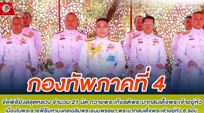 กองทัพภาคที่ 4 จัดพิธียิงสลุตหลวง จำนวน 21 นัด ถวายพระเกียรติพระบาทสมเด็จพระเจ้าอยู่หัว เนื่องในพระราชพิธีมหามงคลเฉลิมพระชนมพรรษา พระบาทสมเด็จพระเจ้าอยู่หัว 6 รอบ 28 กรกฎาคม 2567 ณ สนามบินกองทัพภาคที่ 4