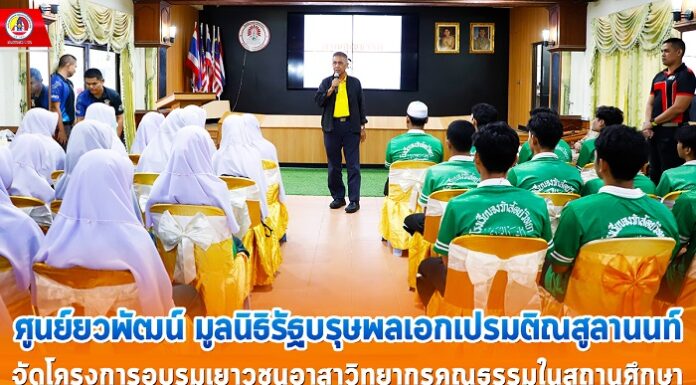 วันที่ 18 กรกฎาคม 2567 ที่ โรงเรียนจงรักสัตย์วิทยา ต.ตันหยงลุโละ อ.เมืองปัตตานี จ.ปัตตานี ศูนย์ยวพัฒน์ มูลนิธิรัฐบรุษพลเอกเปรมติณสูลานนท์ จัดหลักสูตรเชิงปฏิบัติการ “หลักการพื้นฐานคุณธรรมและจริยธรรม“ ในโครงการอบรมเยาวชนอาสาวิทยากรคุณธรรมในสถานศึกษา โดยมีพลเอก ศรุต นาควัชระ ผู้อำนวยการศูนย์ยวพัฒน์ มูลนิธิรัฐบุรุษ พลเอกเปรม ติณสูลานนท์ เป็นวิทยากรบรรยายให้ความรู้เพื่อให้เยาวชนที่เข้าร่วมกิจกรรมได้รู้จักควบคุมตนเองโดยเว้นชั่วตลอดเวลา และทำความดีได้อย่างเหมาะสม โดยมีหลักการสำคัญคืออบรมให้ความรู้แก่เยาวชน เน้นการสร้างวิทยากร กิจกรรมฐานคุณธรรม” เป็นการฝึกเยาวชนรุ่นพี่ให้สามารถเป็นวิทยากร โดยนำความรู้ที่ได้รับไปสอนน้องด้วยการทำหน้าที่วิทยากรอาสา จัดกิจกรรม “ฐานคุณธรรม” เสริมสร้างคุณธรรมสำหรับเยาวชนรุ่นน้อง ซึ่งจะเป็นโครงการที่ดำเนินการ “โดยเยาวชน เพื่อเยาวชน” ซึ่งตลอดการอบรมมีชุดครูหมวกแดง จากชุดควบคุมที่ 951 และชุดควบคุมทักษิณสัมพันธ์ หน่วยเฉพาะกิจสันติสุข ร่วมเป็นวิทยากรให้ความรู้ ควบคู่กับการสร้างความสนุกสนานผ่านกิจกรรมสันทนาการสอดแทรกสร้างความสุขตลอดการอบรม โดยมี คณะครู นักเรียน เข้าร่วม