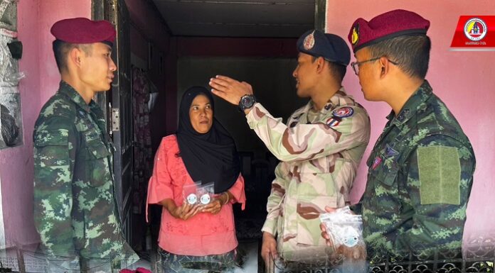 วันที่ 12 ตุลาคม 2567 ณ บริเวณชุมชนรอบฐานปฏิบัติการ หมู่ที่ 1 บ้านโคกตา ตำบลปะลุรู อำเภอสุไหงปาดี จังหวัดนราธิวาส หน่วยเฉพาะกิจสันติสุข โดย ชุดสันติสุขที่ 404 ร่วมกับ ชุดทักษิณสัมพันธ์ที่ 442 และกำลังพลกองร้อยกองอาสารักษารักษาดินแดนสุไหงปาดี 9 ลงพื้นที่ร่วมดำเนินการพ่นหมอกควันกำจัดยุงลาย พร้อมแจกทรายอะเบทให้กับประชาชนในพื้นที่ เพื่อป้องกันและกำจัดยุงลายสาเหตุที่อาจก่อให้เกิดไข้เลือดออกในชุมชน ซึ่งจากสถานการณ์ปัจจุบันยังคงมีผู้ติดเชื้ออยู่ในพื้นที่ ทั้งนี้เพื่อป้องกันไม่ให้เกิดการแพร่ระบาดในชุมชนทุกภาคส่วนจึงร่วมดำเนินการพ่นหมอกควันกำจัดยุงลายในแต่ละพื้นที่อย่างต่เนื่อง อีกทั้งยังลดรายจ่ายให้กับประชาชน พร้อมให้คำแนะนำกับประชาชนเกี่ยวกับโรคไข้เลือดออก การกำจัดลูกน้ำยุงลาย การทำความสะอาดบ้านเรือน เพื่อเป็นการป้องกันและลดการแพร่ระบาดของโรคไข้เลือดออกต่อไป