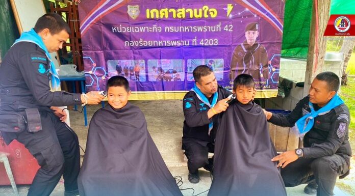 “เกศาสานใจ เชื่อมรักสานสัมพันธ์” ทหารพราน 42 บริการตัดผมให้กับนักเรียน ในพื้นที่ตำบลปิยามุมัง อำเภอยะหริ่ง จังหวัดปัตตานี