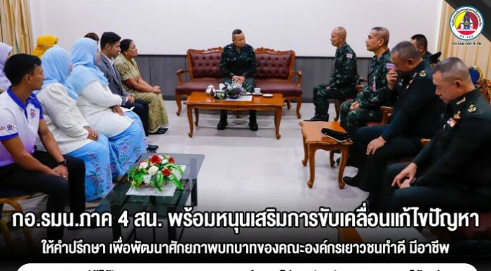 กอ.รมน.ภาค 4 สน. พร้อมหนุนเสริมการขับเคลื่อนแก้ไขปัญหา ให้คำปรึกษา เพื่อพัฒนาศักยภาพบทบาทของคณะองค์กรเยาวชนทำดี มีอาชีพ และมูลนิธิสตรีผู้ได้รับผลกระทบจากสถานการณ์ความไม่สงบจังหวัดชายแดนภาคใต้ (เยียวยา)