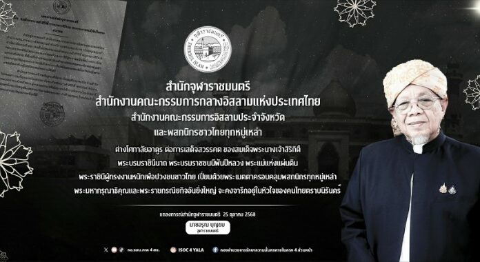 สำนักจุฬาราชมนตรี ออกแถลงการณ์แสดงความอาลัยอย่างสุดซึ้ง ต่อการเสด็จสวรรคตของ สมเด็จพระนางเจ้าสิริกิติ์ พระบรมราชินีนาถ พระบรมราชชนนีพันปีหลวง