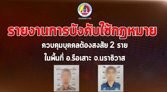 วันนี้ (วันที่ 2 พฤษภาคม 2567) เวลาประมาณ 08.30 น. หน่วยปฏิบัติการพิเศษร่วมประจำจังหวัดนราธิวาส (กองกำกับการสืบสวนตำรวจภูธรจังหวัดนราธิวาส, ชุดปฏิบัติการพิเศษหน่วยเฉพาะกิจกรมทหารพรานที่ 46, งานสืบสวนคดีความมั่นคงและคดีพิเศษ ศูนย์ปฏิบัติการสำนักงานตำรวจแห่งชาติ ส่วนหน้า และกองกำลังทางอากาศเฉพาะกิจที่ 9) ร่วมกับ สถานีตำรวจภูธรรือเสาะ ประสานการปฏิบัติกับหน่วยเฉพาะกิจกรมทหารพรานที่ 46 เข้าบังคับใช้กฎหมายควบคุมตัวผู้ต้องสงสัยตามหมายจับศาลจังหวัดนราธิวาส จำนวน 2 ราย รายละเอียดดังนี้