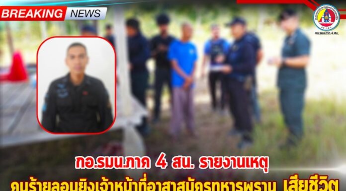 กอ.รมน.ภาค 4 สน. รายงานเหตุ คนร้ายลอบยิงเจ้าหน้าที่อาสาสมัครทหารพราน เสียชีวิต พื้นที่ อ.ธารโต จ.ยะลา