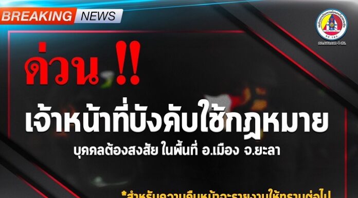 เมื่อวันที่ 17 เมษายน 2567 เวลา 04.00 น. หน่วยปฏิบัติการพิเศษร่วมประจำจังหวัดยะลา ได้สนธิกำลัง 3 ฝ่าย เข้าบังคับใช้กฎหมายเพื่อตรวจสอบบุคคลต้องสงสัย ในพื้นที่อำเภอเมือง จังหวัดยะลา ปัจจุบันเจ้าหน้าที่อยู่ระหว่างดำเนินการ สำหรับความคืบหน้าจะรายงานให้ทราบต่อไป