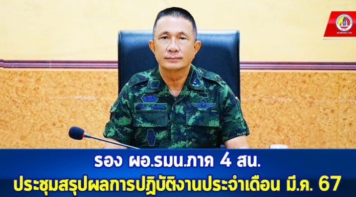 รอง ผอ.รมน.ภาค 4 สน. ประชุมสรุปผลการปฏิบัติงานประจำเดือน มี.ค. 67 พร้อมระบุ จนท.อส.พร้อมดูแลประชาชน ย้ำประชาชนต้องปลอดภัยเจ้าหน้าที่ต้องไม่สูญเสีย