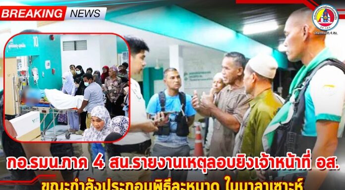 กอ.รมน.ภาค 4 สน.รายงานเหตุลอบยิงเจ้าหน้าที่ อส. ขณะกำลังประกอบพิธีละหมาด ในบาลาเซาะห์ พื้นที่บ้านลือมุ อ.กรงปินัง จ.ยะลา