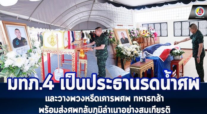 มทภ.4 เป็นประธานรดน้ำศพและวางพวงหรีดเคารพศพ 2 อส.ทพ. ผู้กล้า พร้อมส่งศพกลับภูมิลำเนาอย่างสมเกียรติ