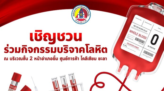 เชิญชวนร่วมกิจกรรมบริจาคโลหิต ณ บริเวณชั้น 2 หน้าอำเภอยิ้ม ศูนย์การค้า โคลีเซียม ยะลา
