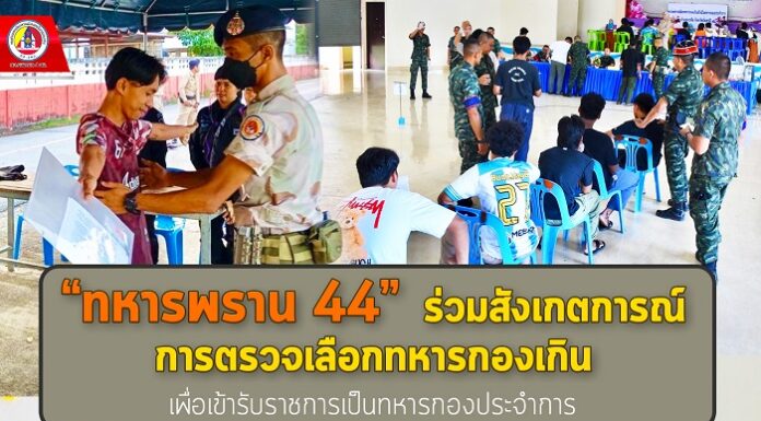 วันที่ 2 เมษายน 2567 พันเอก ภาคภูมิ จันทรักษ์ ผู้บังคับหน่วยเฉพาะกิจกรมทหารพรานที่ 44 ร่วมกับ นายอำเภอกะพ้อ, ส่วนราชการที่เกี่ยวข้อง และผู้นำชุมชนในพื้นที่ อำเภอกะพ้อ จังหวัดปัตตานี เข้าร่วมสังเกตการณ์ และตรวจเยี่ยมให้กำลังใจ ทหารกองเกินที่มารับการตรวจเลือกเข้าเป็นทหารกองประจำการ ประจำปี 2567 และเจ้าหน้าที่คณะกรรมการตรวจเลือกทหารกองเกิน คณะที่ 1 ประจำจังหวัดปัตตานี ในการปฏิบัติหน้าที่ พร้อมเชิญชวนผู้เข้ารับการตรวจเลือกทหาร เข้ามาเป็นครอบครัวเดียวกัน เข้ามาฝึกระเบียบวินัย ความเป็นผู้นำ มีงาน มีรายได้ ต่อยอดโอกาสในการเข้ารับราชการทหารในอนาคต