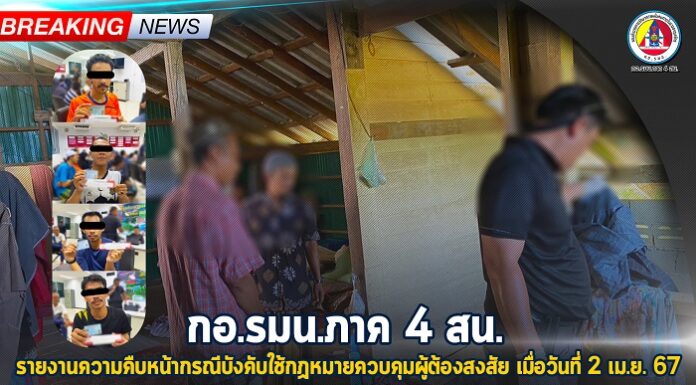 กอ.รมน.ภาค 4 สน. รายงานความคืบหน้ากรณีบังคับใช้กฎหมายควบคุมผู้ต้องสงสัย จำนวน 2 คน เมื่อวันที่ 2 เม.ย. 67 จากเหตุปล้นรถยนต์บริษัทหาดทิพย์ พื้นที่ อ.จะแนะ และปล้นทรัพย์ร้านอัครวัสดุภัณฑ์ อ.ระแงะ จ.นราธิวาส (เมื่อวันที่ 11 มี.ค. 67)