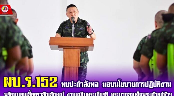 ผบ.ร.152 พบปะกำลังพลเพื่อมอบนโยบายการปฏิบัติงาน พร้อมมอบเสื้อตราสัญลักษณ์ งานเฉลิมพระเกียรติ พระบาทสมเด็จพระเจ้าอยู่หัวฯ ให้กับกำลังพลไว้สวมใส่ในโอกาสต่างๆต่อไป