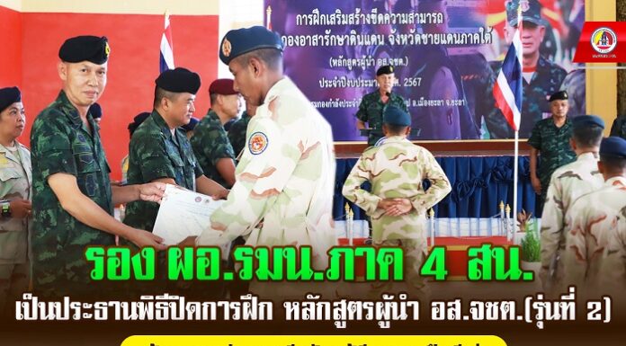 รอง ผอ.รมน.ภาค 4 สน.เป็นประธานพิธีปิดการฝึก หลักสูตรผู้นำ อส.จชต.(รุ่นที่ 2) พร้อมมอบประกาศนียบัตรผู้มีผลการฝึกดีเด่น