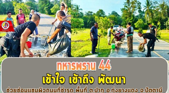 “ทหารพราน 44” เข้าใจ เข้าถึง พัฒนา ช่วยซ่อมแซมผิวถนนที่ชำรุด ในพื้นที่ ต.ปากู อ.ทุ่งยางแดง จ.ปัตตานี