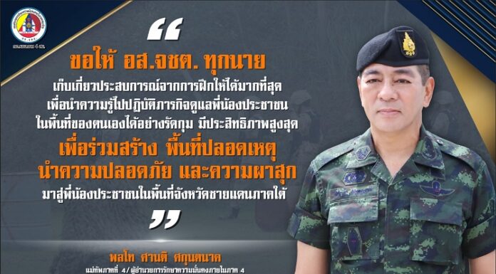 “ขอให้ อส.จชต. ทุกนาย เก็บเกี่ยวประสบการณ์จากการฝึกให้ได้มากที่สุด เพื่อนำความรู้ไปปฏิบัติภารกิจดูแลพี่น้องประชาชนในพื้นที่ของตนเองได้อย่างรัดกุม มีประสิทธิภาพสูงสุด เพื่อร่วมสร้าง พื้นที่ปลอดเหตุ นำความปลอดภัย และความผาสุก มาสู่พี่น้องประชาชนในพื้นที่จังหวัดชายแดนภาคใต้”