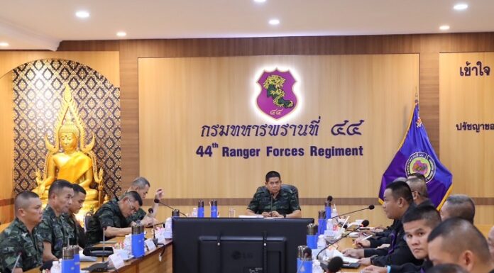วันนี้ (1 มิถุนายน 2567) เวลา 08.30 น. พลตรี ไพศาล หนูสังข์ รองแม่ทัพภาคที่ 4 / รองผู้อำนวยการรักษาความมั่นคงภายในภาค 4 ส่วนหน้า พร้อมด้วยคณะฯ ลงพื้นที่ตรวจเยี่ยมการปฏิบัติงานของ หน่วยเฉพาะกิจกรมทหารพรานที่ 44 อำเภอสายบุรี จังหวัดปัตตานี พร้อมรับฟังบรรยายสรุปผลการปฏิบัติงานของหน่วย รับฟังปัญหาข้อขัดข้อง และร่วมหารือแนวทางการแก้ไขการปฏิบัติงานห้วงที่ผ่านมา โดยมี พันเอก วรจิตร ศาสตร์ศิลป์ รองผู้บังคับหน่วยเฉพาะกิจปัตตานี, พันเอก ภาคภูมิ จันทรักษ์ ผู้บังคับหน่วยเฉพาะกิจกรมทหารพรานที่ 44, ผู้บังคับกองร้อยทหารพรานในพื้นที่ พร้อมกำลังพลร่วมให้การต้อนรับและเข้าร่วมประชุมฯ