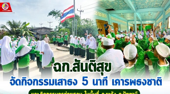 วันที่ 26 พฤษภาคม 2567 ที่ศูนย์การศึกษาอิสลามประจำมัสยิดดารุสลาม (ตรอซัน) บ้านพงสตา หมู่ที่ 5 ตำบลยะรัง อำเภอยะรัง จังหวัดปัตตานี หน่วยเฉพาะกิจสันติสุข โดย ชุดสันติสุขที่ 101 ร่วมกับ ชุดทักษิณสัมพันธ์ที่ 112 ดำเนินกิจกรรมเสาธง 5 นาที เคารพธงชาติ เพื่อปลุกจิตสำนึกให้เด็ก เยาวชน รู้คุณชาติ ศาสนา พระมหากษัตริย์ ปฏิบัติตนอยู่ในกรอบของกฎหมาย ตลอดจนปกป้องชาติ ศาสนา พระมหากษัตริย์ ให้สามสถาบันหลักของชาติเป็นศูนย์รวมจิตใจของปวงชนในชาติ และสามารถดำรงอยู่คู่กับประชาธิปไตยอย่างมั่นคงต่อไป อีกทั้งยังจัดกิจกรรมครูช่วยสอน ให้ความรู้กับเด็กนักเรียนในหัวข้อ เรื่อง โทษและพิษภัยของยาเสพติด เพื่อให้เด็กได้ตระหนักถึงโทษและพิษภัยของยาเสพติด รู้จักใช้เวลาว่างให้เกิดประโยชน์ พร้อมกับมอบอุปกรณ์กีฬาสำหรับซักซ้อม และไว้แข่งขันในกิจกรรมต่างๆ