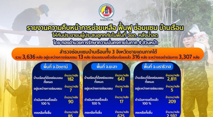 จากสถานการณ์อุทกภัยในพื้นที่จังหวัดชายแดนภาคใต้ ทั้งจังหวัดปัตตานี ยะลา นราธิวาส และบางส่วนของจังหวัดสงขลา ที่เกิดขึ้นเมื่อวันที่ 22 – 26 ธันวาคม 2566 ที่ผ่านมา กองอำนวยการรักษาความมั่นคงภายในภาค 4 ส่วนหน้า โดย พลโท ศานติ ศกุนตนาค แม่ทัพภาคที่ 4 / ผู้อำนวยการรักษาความมั่นคงภายในภาค 4 ได้บูรณาการกับหคน่วยงานในพื้นที่เข้าดำเนินการช่วยเหลือ ฟื้นฟู ซ่อมแซมบ้านเรือนให้แก่ประชาชนผู้ได้รับผลกระทบโดยทันที