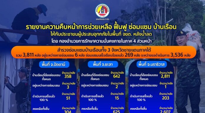 รายงานความคืบหน้าการช่วยเหลือ ฟื้นฟู ซ่อมแซม บ้านเรือนให้กับประชาชนผู้ประสบอุทกภัย ในพื้นที่ จชต. หลังน้ำลด (ข้อมูล ณ วันที่ 21 ม.ค. 67)