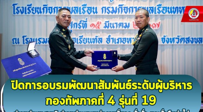 เมื่อวันที่ (15 มีนาคม 2567) เวลา 10.00 น. ณ โรงแรมสยามออเรียนทัล อำเภอหาดใหญ่ จังหวัดสงขลา พลโท ศานติ ศกุนตนาค แม่ทัพภาคที่ 4 / ผู้อำนวยการรักษาความมั่นคงภายในภาค 4 เป็นประธานปิดการอบรมพัฒนาสัมพันธ์ระดับผู้บริหาร กองทัพภาคที่ 4 (พสบ.ทภ. 4) รุ่นที่ 19 จัดขึ้นโดย โรงเรียนกิจการพลเรือนกรมกิจการพลเรือนทหารบก เพื่อผนึกกำลัง และสร้างเครือข่ายระดับผู้บริหาร ที่มีศักยภาพ และขีดความสามารถในด้านต่าง ๆ เข้ามาเป็นส่วนหนึ่งของการพัฒนาสังคมในพื้นที่ภาคใต้ในทุกมิติ พร้อมกันนี้ แม่ทัพภาคที่ 4 ได้มอบใบประกาศนียบัตรฯ ให้กับผู้ที่เข้าร่วมอบรมฯ เพื่อเป็นขวัญกำลังใจในการขับเคลื่อนการทำงานให้เกิดประโยชน์ต่อประเทศชาติอย่างสูงสุด โดยมี ผู้บังคับบัญชาระดับสูงของกองทัพภาคที่ 4 วิทยากรผู้ทรงคุณวุฒิ ผู้เข้ารับการอบรมหลักสูตรฯ เข้าร่วมพิธี