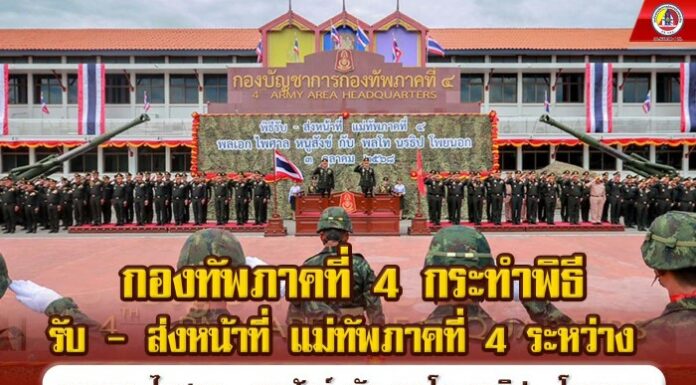 กองทัพภาคที่ 4 กระทำพิธี รับ – ส่งหน้าที่ แม่ทัพภาคที่ 4 ระหว่าง พลเอก ไพศาล หนูสังข์ กับ พลโท นรธิป โพยนอก อย่างสมเกียรติ