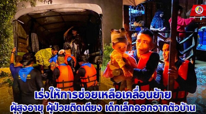 โดยเฉพาะผู้ป่วยติดเตียง ผู้หญิง และคนชราออกนอกพื้นที่โดยเร็วที่สุด ย้ำ!การเข้าช่วยเหลือเจ้าหน้าที่ทุกคนต้องมีความระมัดระวังรักษาความปลอดภัยตนเองและทุกคนที่ลงไปจะต้องใส่เสื้อชูชีพ
