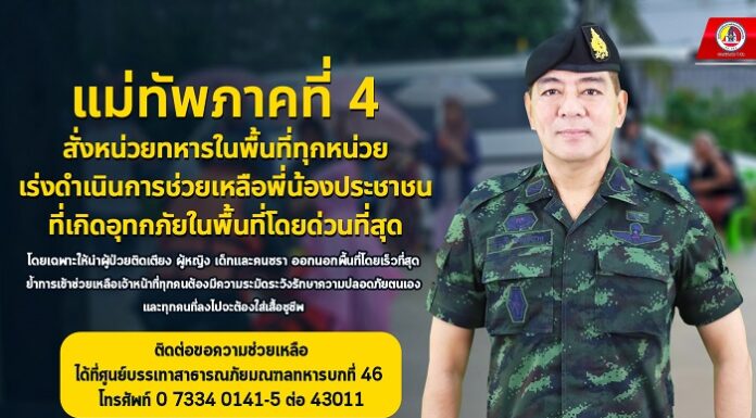 แม่ทัพภาคที่ 4 สั่งหน่วยทหารในพื้นที่ทุกหน่วย เร่งดำเนินการช่วยเหลือพี่น้องประชาชนที่เกิดอุทกภัยในพื้นที่โดยด่วนที่สุด