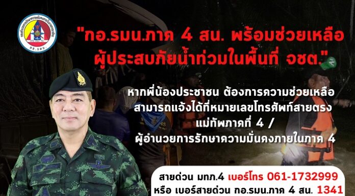 หากพี่น้องประชาชนต้องการความช่วยเหลือสามารถแจ้งได้ที่หมายเลขโทรศัพท์สายตรงแม่ทัพภาคที่ 4 / ผู้อำนวยการรักษาความมั่นคงภายในภาค 4
