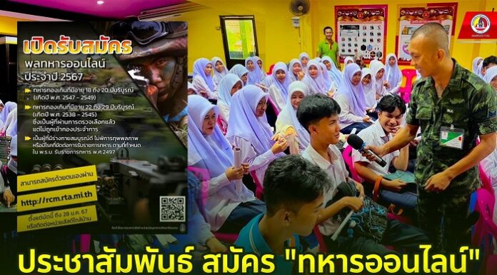 ประชาสัมพันธ์ สมัคร “ทหารออนไลน์” ประจำปี 2567 ในทุกช่องทาง ตามนโยบายของกองทัพบกที่ต้องการเชิญชวนน้องๆชายไทยมาเป็นส่วนหนึ่งในการพัฒนากองทัพ