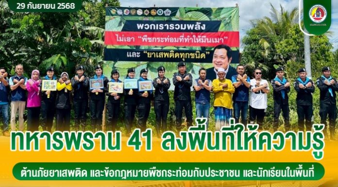 ทหารพราน 41 ลงพื้นที่ให้ความรู้ต้านภัยยาเสพติด และข้อกฎหมายพืชกระท่อมกับประชาชน และนักเรียนในพื้นที่