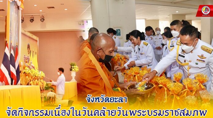 วันนี้ (5 ธันวาคม 2566) เวลา 07.30 น. ณ ห้องประชุมเฉลิมพระเกียรติ 80 พรรษา 5 ธันวาคม 2550 มหาวิทยาลัยราชภัฏยะลา อำเภอเมือง จังหวัดยะลา นายอำพล พงศ์สุวรรณ ผู้ว่าราชการจังหวัดยะลา ประธานในพิธี พร้อมด้วย พลตรี เฉลิมพงค์ คงบัว เลขาธิการกองอำนวยการรักษาความมั่นคงภายในภาค 4 ส่วนหน้า นำข้าราชการ ทหาร ตำรวจ หน่วยงานภาครัฐ ภาคเอกชน เหล่ากาชาดจังหวัดยะลา และพสกนิกรชาวจังหวัดยะลาทุกหมู่เหล่า ร่วมประกอบพิธีทำบุญตักบาตร ถวายเป็นพระราชกุศล เนื่องในวันคล้ายวันพระบรมราชสมภพ พระบาทสมเด็จพระบรมชนกาธิเบศร มหาภูมิพลอดุลยเดชมหาราช บรมนาถบพิตร วันชาติ และวันพ่อแห่งชาติ 5 ธันวาคม 2566 เพื่อน้อมรำลึกในพระมหากรุณาธิคุณของพระบาทสมเด็จพระบรมชนกาธิเบศร มหาภูมิพลอดุลยเดชมหาราช บรมนาถบพิตร