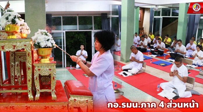 วันที่ 5 ธันวาคม 2566 เวลา 19.00 น. ที่ ลานปฏิบัติธรกอ.รมน.ภาค 4 ส่วนหน้า นำกำลังพลไหว้พระสวดมนต์ในวันธรรมสวนะ ประจำเดือนธันวาคมรมเขาพระศรีศากยมุณีพุทธโคดม ค่ายสิรินธร ตำบลเขาตูม อำเภอยะรัง จังหวัดปัตตานี พันเอกหญิง กรชุลี ปัทมานนท์ หัวหน้าสำนักงานเลขาธิการ กองอำนวยการรักษาความมั่นคงภายในภาค 4 ส่วนหน้า เป็นประธานในกิจกรรมไหว้พระสวดมนต์ ทำวัตรเย็นเจริญจิตภาวนา เนื่องในวันพระ ประจำเดือนธันวาคม 2566 เพื่อให้กำลังพลได้ปฏิบัติตนตามแบบพุทธศาสนิกชนที่ดีด้านการสวดมนต์ไหว้พระ รักษาศีลในวันธรรมสวนะ เห็นคุณค่าของหลักธรรมคำสั่งสอนของพระพุทธเจ้า และนำหลักธรรมปรับใช้ในชีวิตประจำวันได้อย่างถูกต้องและเหมาะสม โดยมีกำลังพล และครอบครัว เข้าร่วมกิจกรรม