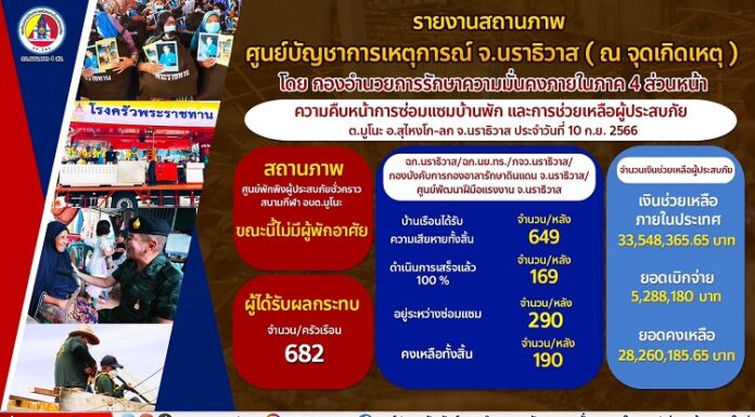 ศูนย์บัญชาการเหตุการณ์จังหวัดนราธิวาส รายงานสถานภาพถึงความคืบหน้า และภาพรวมการช่วยเหลือของกองอำนวยการรักษาความมั่นคงภายในภาค 4 ส่วนหน้า รวมทั้งหน่วยงานที่เกี่ยวข้องดำเนินการช่วยเหลือพี่น้องชาวมูโนะ โดยจัดกำลังพลจิตอาสาชุดช่างพร้อมอุปกรณ์ กว่า 233 นาย ลงพื้นที่เร่งซ่อมแซมบ้านเรือน ซึ่งข้อมูลวันที่ 10 กันยายน 2566 ได้ซ่อมแซมบ้านเรียบร้อยแล้ว 169 หลัง อยู่ระหว่างดำเนินการ 290 หลัง ส่วนบ้านที่ต้องสร้างใหม่ทั้งหลังจำนวน 82 หลัง ได้ทำการปรับหน้าดินแล้ว 13 หลัง ขณะบ้านที่มีประกันอัคคีภัย 26 หลัง ดำเนินการจ่ายสินไหมทดแทนแล้ว 24 หลัง