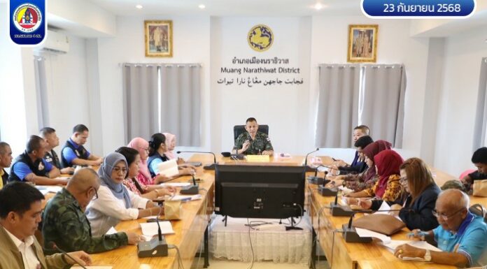 วันนี้ (23 กันยายน 2568) ที่ ห้องประชุม ว่าการอำเภอเมืองนราธิวาส ตำบลบางนาค อำเภอเมือง จังหวัดนราธิวาส พลตรี ชาติชาย เกื้อกิจ ผู้อำนวยการส่วนพัฒนายุทธศาสตร์ กองอำนวยการรักษาความมั่นคงภายในภาค 4 ส่วนหน้า เป็นประธานประชุมติดตามความก้าวหน้าการบูรณาการแก้ไขปัญหาเด็กและสตรีในจังหวัดชายแดนภาคใต้ ด้วยกลไกฮูกุมปากัต (ธรรมนูญหมู่บ้าน / โรงเรียน) 9 ดี โดยมี ผู้แทนหน่วยเฉพาะกิจนราธิวาส, ผู้แทน ฉก.สันติสุข, ผู้แทน ศูนย์ขับเคลื่อนการศึกษาในจังหวัดชายแดนภาคใต้ (ศค.จชต.), ผู้แทนศูนย์อนามัยแม่และเด็กที่ 12 ยะลา, ปลัดอำเภอหัวหน้าปะจำตำบลบางนาค, ผู้แทน สำนักงานเขตพื้นที่การศึกษาประถมศึกษา นราธิวาส เขต 1, รองผู้อำนวยการโรงเรียนนราธิวาส, ผู้แทนพัฒนาชุมชน, ผู้แทน สำนักงานพัฒนาสังคมและความมั่นคงของมนุษย์จังหวัดนราธิวาส, องค์การบริหารส่วนจังหวัดนราธิวาส, เจ้าหน้าที่โรงพยาบาลส่งเสริมสุขภาพตำบลบางนาค, บัณฑิตอาสามาตุภูมิ, ประธานชุมชนวัดบางนาค ตลอดจนเจ้าหน้าที่ที่เกี่ยวข้องเข้าร่วม