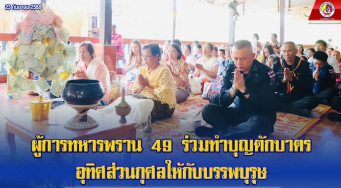 วันที่ 22 กันยายน 2568 เวลา 09.30 น. พันเอก พัศวีร์ โปชะดา ผู้บังคับหน่วยเฉพาะกิจกรมทหารพรานที่ 49 พร้อมด้วย ร้อยเอก วิฑูรย์ คุ้มภัย ผู้ช่วยหัวหน้าฝ่ายกิจการพลเรือนหน่วยเฉพาะกิจกรมทหารพรานที่ 49 และกำลังพลชุดปฏิบัติการกิจการพลเรือนหมวดทหารพรานหญิงที่ 49 ร่วมกับ ประชาชนชุมชนไทยพุทธในพื้นที่บ้านไอร์เจี๊ยะ ร่วมทำบุญตักบาตรถวายภัตตาหารแด่พระสงฆ์ และทำบุญอุทิศส่วนกุศลให้กับบรรพบุรุษ เนื่องในเทศกาลสารทเดือนสิบ (ส่งตายาย) (แรม 15 ค่ำ เดือน 10 ปีมะเส็ง ) เพื่อเป็นการแสดงความกตัญญู และทำบุญอุทิศส่วนกุศลแก่บรรพชน และบรรพบุรุษที่ได้ล่วงลับไปแล้ว รวมทั้งเพื่อเป็นการรักษาไว้ซึ่งประเพณีอันดีงามให้คงอยู่สืบไป ณ วัดไอร์เจี๊ยะมังคลาราม หมู่ที่ 5 บ้านไอร์เจี๊ยะ ตำบลซากอ อําเภอศรีสาคร จังหวัดนราธิวาส