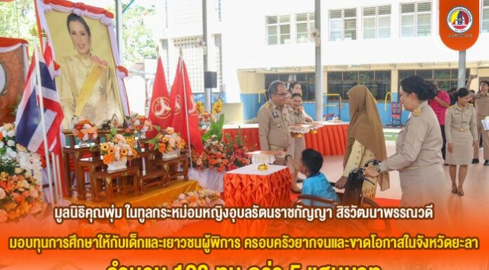 มูลนิธิคุณพุ่ม ในทูลกระหม่อมหญิงอุบลรัตนราชกัญญา สิริวัฒนาพรรณวดี มอบทุนการศึกษาให้กับเด็กและเยาวชนผู้พิการ ครอบครัวยากจนและขาดโอกาสในจังหวัดยะลา จำนวน 108 ทุน กว่า 5 แสนบาท