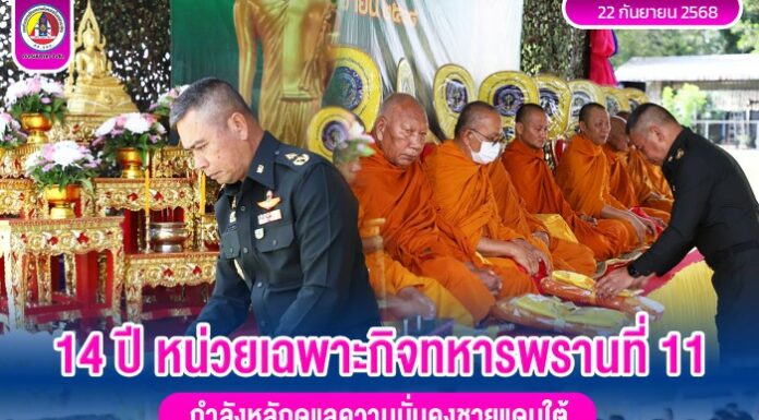 วันนี้ (23 กันยายน 2568) เวลา 10.00 น. ณ หน่วยเฉพาะกิจกรมทหารพรานที่ 11 ตำบลโละจูด อำเภอแว้ง จังหวัดนราธิวาส พลตรี เสฏฐวุฒิ จันทนะ เลขาธิการกองอำนวยการรักษาความมั่นคงภายในภาค 4 ส่วนหน้า เป็นประธานในพิธีวันสถาปนาหน่วยเฉพาะกิจกรมทหารพรานที่ 11 ครบรอบปีที่ 14 โดยมีคณะผู้บังคับบัญชา ตลอดจนกำลังพลเข้าร่วมอย่างพร้อมเพรียง