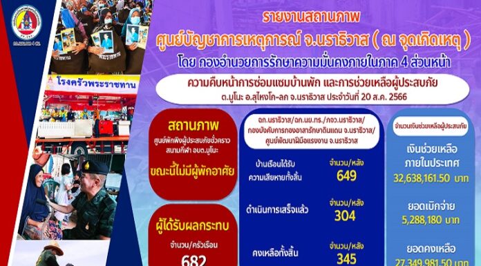 กองอำนวยการรักษาความมั่นคงภายในภาค 4 ส่วนหน้า ร่วมกับภาคีเครือข่ายภาครัฐ จัดกำลังพลจิตอาสาให้ความช่วยเหลือพี่น้องชาวมูโนะต่อเนื่อง ล่าสุดข้อมูลวันที่ 20 สิงหาคม 2566 โดยศูนย์บัญชาการเหตุการณ์จังหวัดนราธิวาส รายงานสถานภาพถึงความคืบหน้า และภาพรวมการช่วยเหลือของกองอำนวยการรักษาความมั่นคงภายในภาค 4 ส่วนหน้า โดยหน่วยเฉพาะกิจนราธิวาส, หน่วยเฉพาะกิจนาวิกโยธิน กองทัพเรือ, ตำรวจภูธรจังหวัดนราธิวาส , กองบังคับการกองอาสารักษาดินแดน จังหวัดนราธิวาส และ ศูนย์พัฒนาฝีมือแรงงาน จังหวัดนราธิวาส รวมทั้งหน่วยงานที่เกี่ยวข้องดำเนินการซ่อมสร้างบ้านเรือนที่ได้รับความเสียหายจากเหตุดังกล่าวแล้ว 304 หลัง และยังคงเร่งดำเนินการอย่างต่อเนื่อง อีก 345 หลัง เพื่อให้ประชาชนกลับไปใช้ชีวิตได้ตามปกติโดยเร็ว