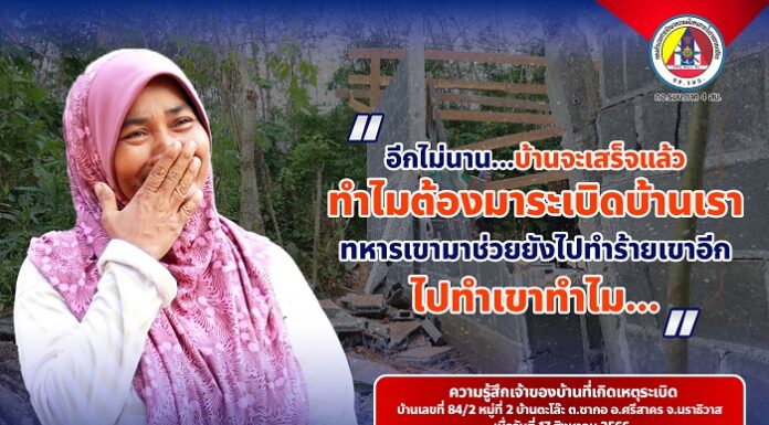 “อีกไม่นาน…บ้านจะเสร็จแล้ว ทำไมต้องมาระเบิดบ้านเรา ทหารเขามาช่วย….. ยังไปทำร้ายเขาอีก ไปทำเขาทำไม…”
